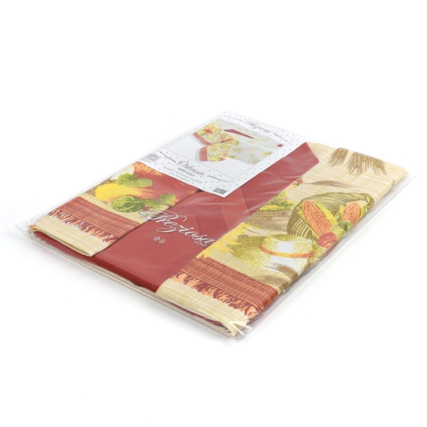 Raffinato servizio da tavola composto da tovaglia e tovaglioli, realizzato in puro cotone. Servizio posti. Misure servizio da 6: 140*180 + 6 tovaglioli Misure servizio da 12: 140*240 + 12 tovaglioli Bellissima tovaglia a fondo bianco, nella parte centrale decorata da spighe di grano, verso i bordi diventa riccamente decorata da ortaggi e fiori, con bordatura arancio effetto frangia. Sui toni del beige, giallo e più sfumature arancio. Completa di tovaglioli di tinta unita arancio intenso.