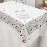 Delicati fiori sono i protagonisti del motivo della tovaglia da tavola di Neith, realizzata in puro cotone di Panama